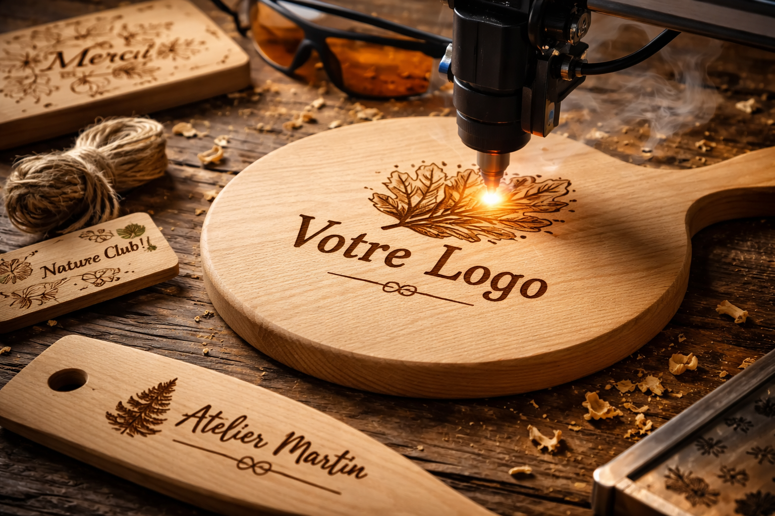 La personnalisation est réalisée via PYRO by La forêt Bleue, dédié aux objets en bois gravés au laser.